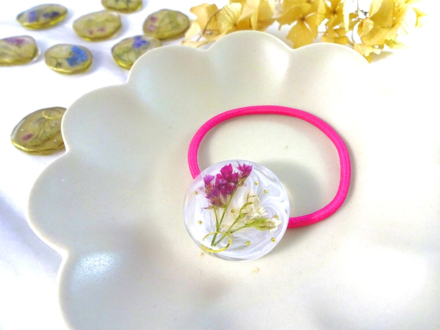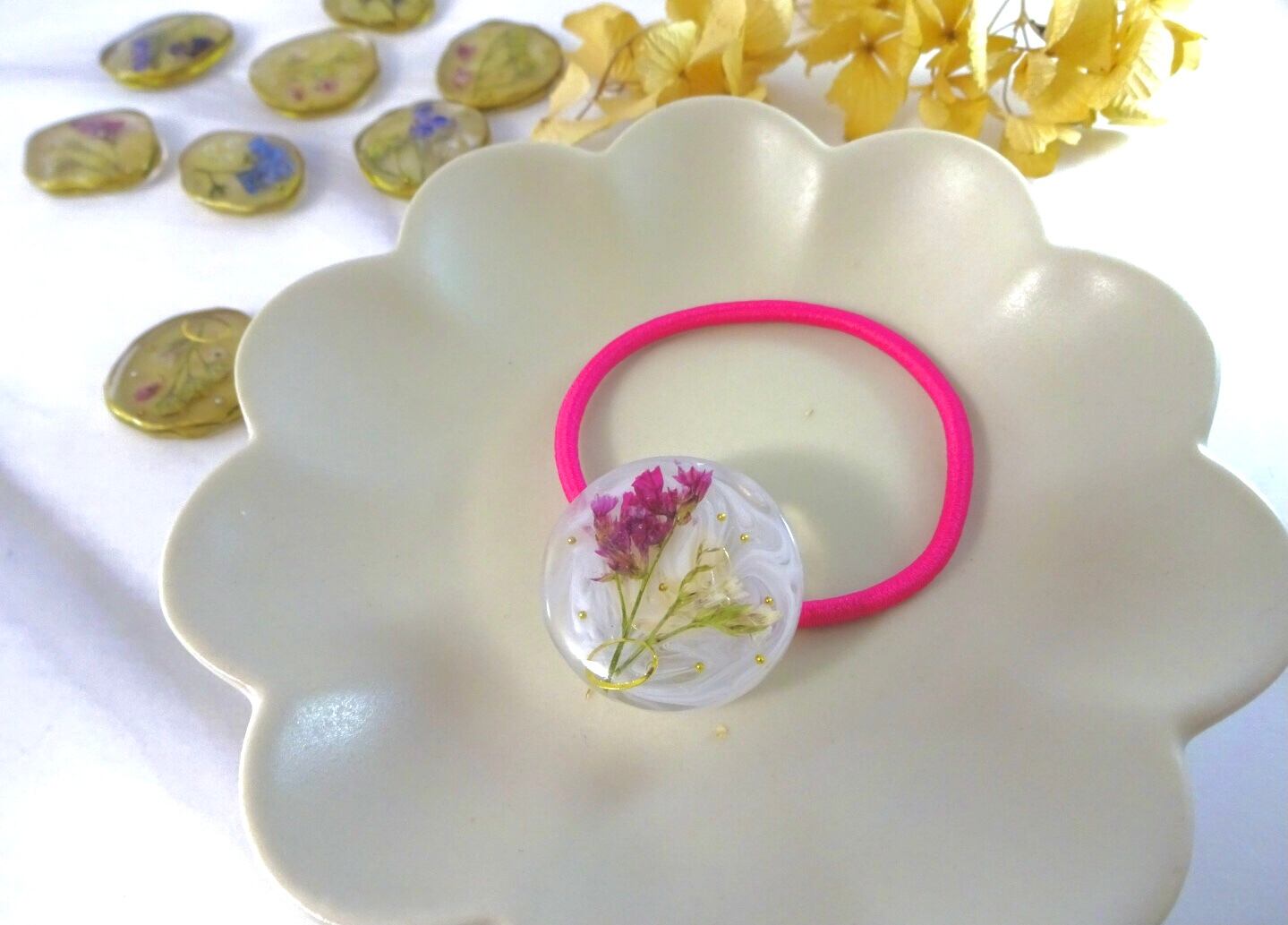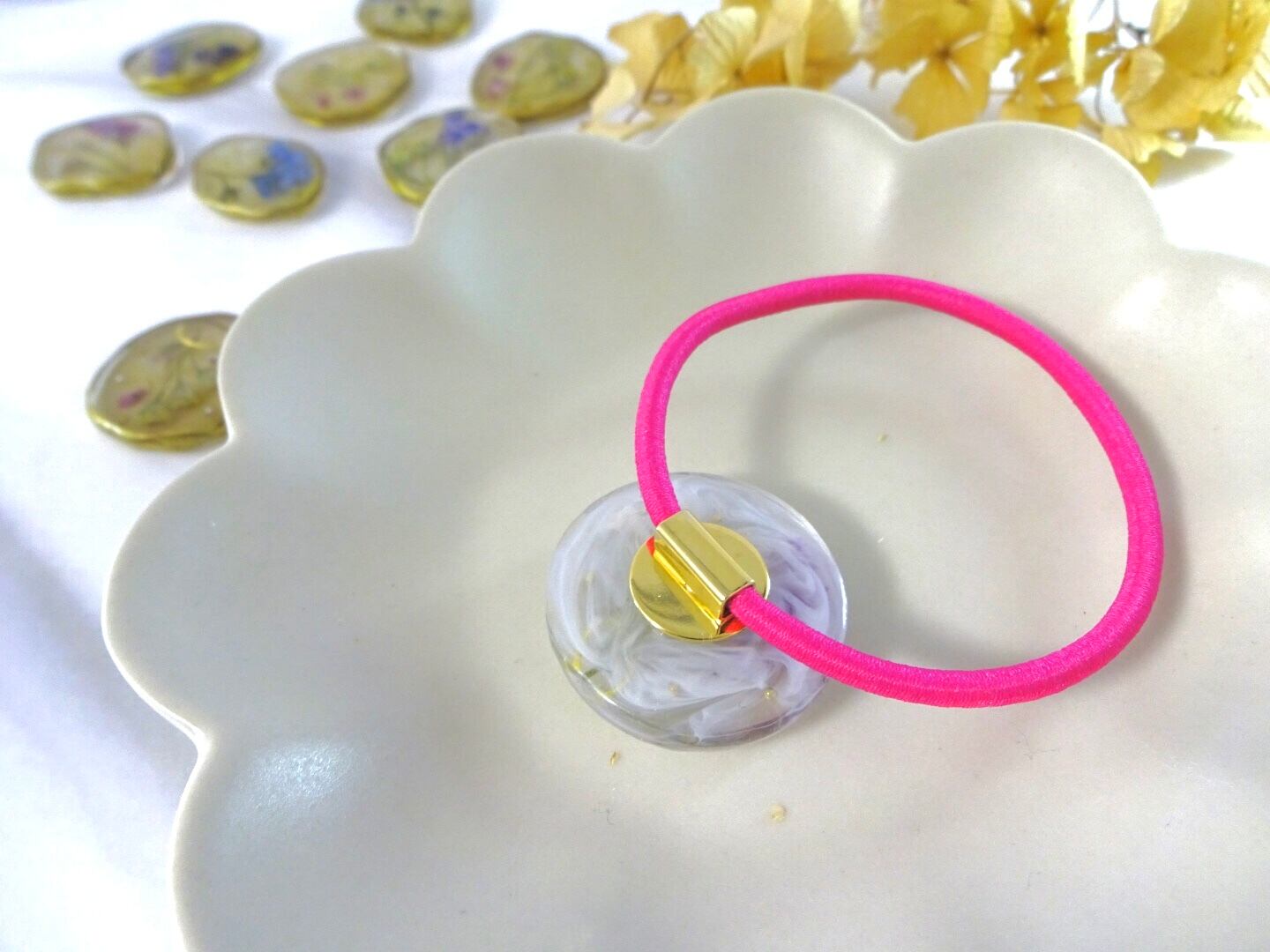 レジンのデザインパーツをひとつひとつ手作りしています。そのため同じデザインを作ったとしても、色や形がわずかに異なります。すべての作品はほぼ一点ものであることをご理解くださいませ。