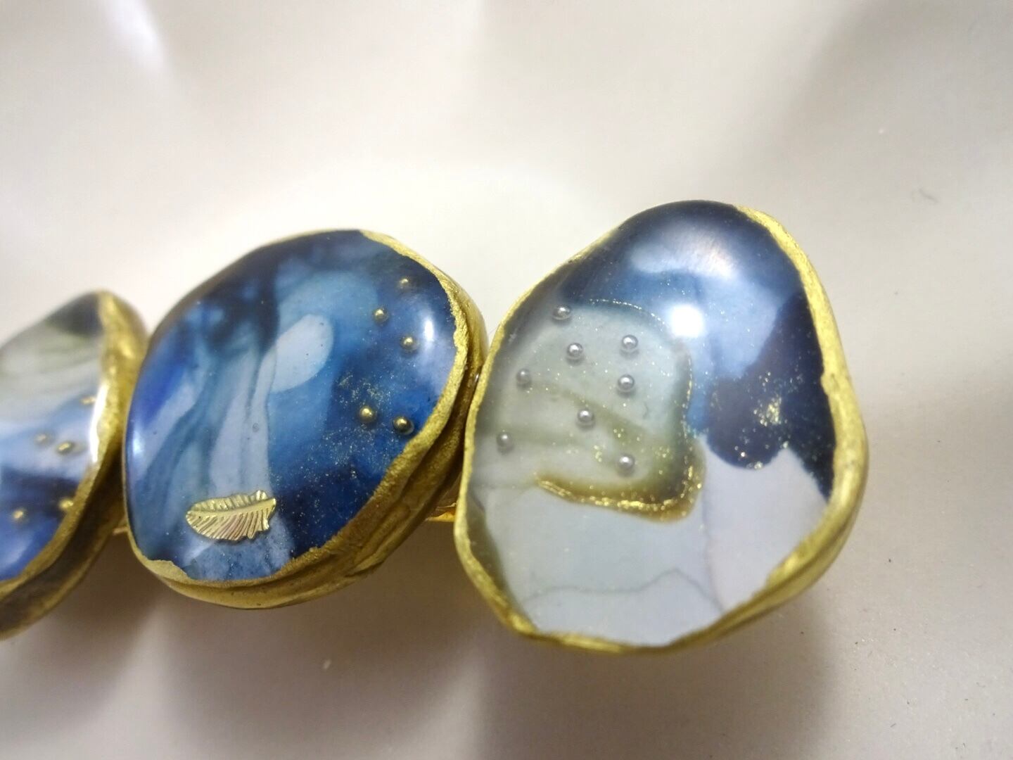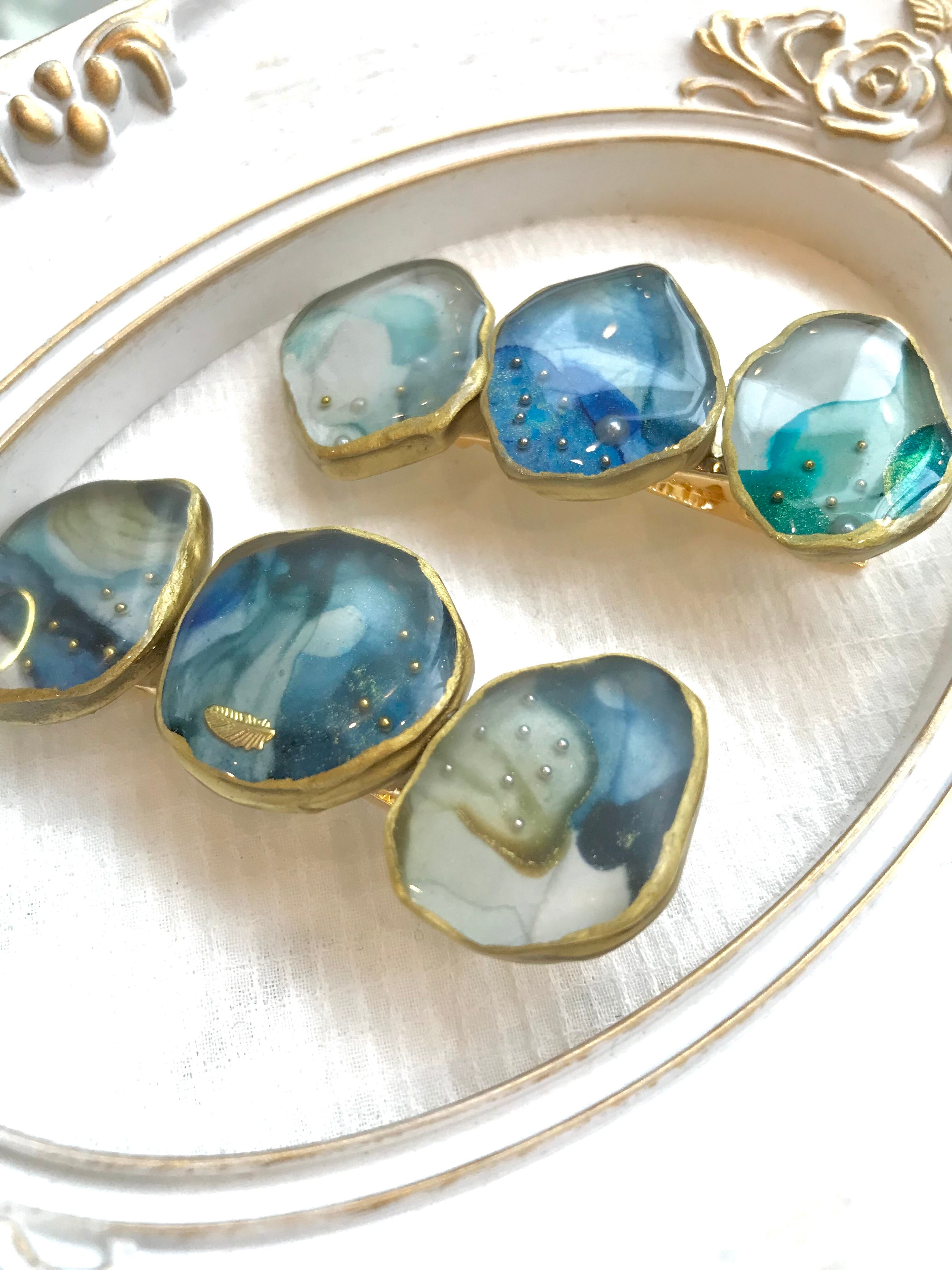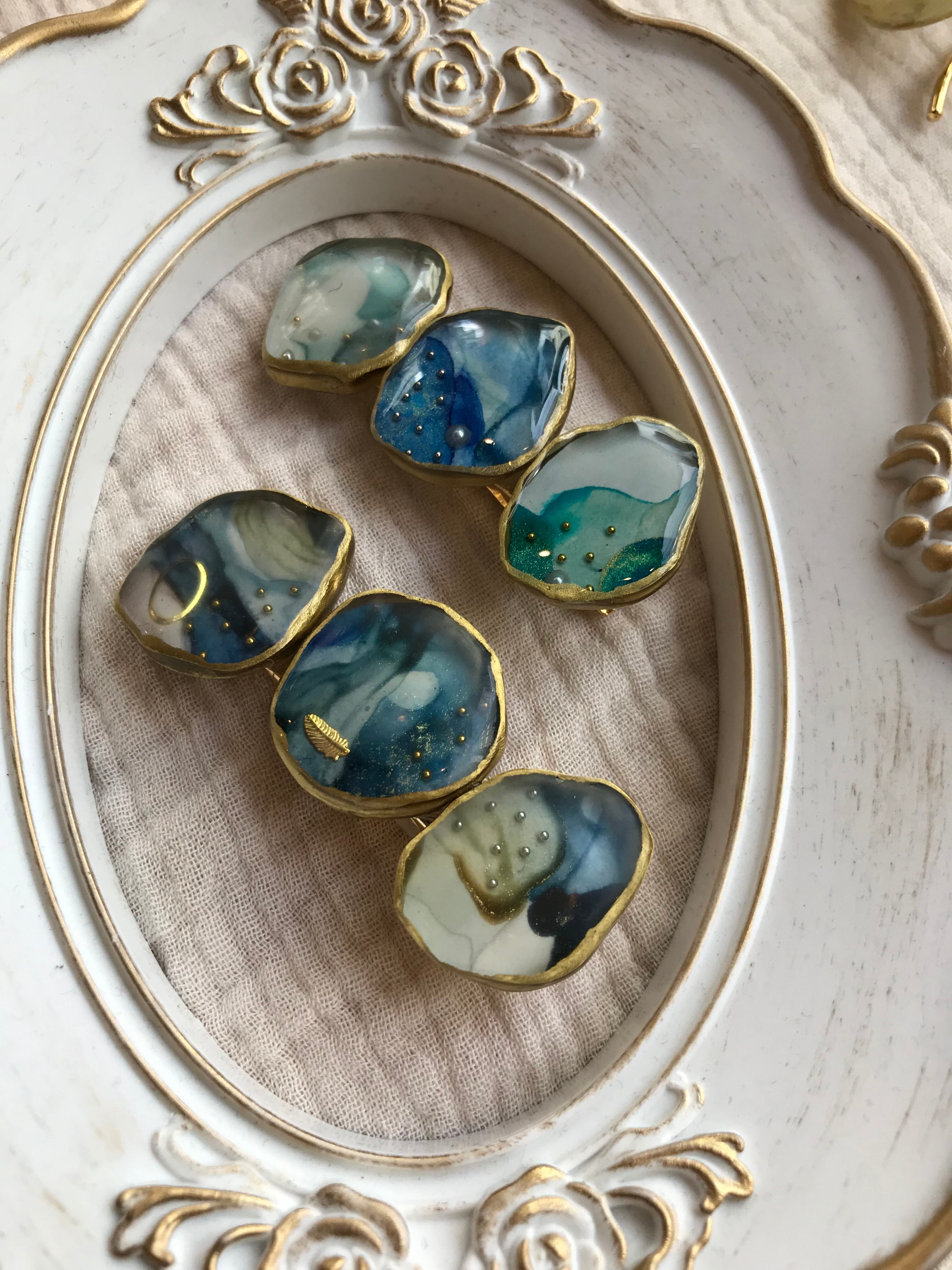 レジンのデザインパーツをひとつひとつ手作りしています。そのため同じデザインを作ったとしても、色や形がわずかに異なります。すべての作品はほぼ一点ものであることをご理解くださいませ。