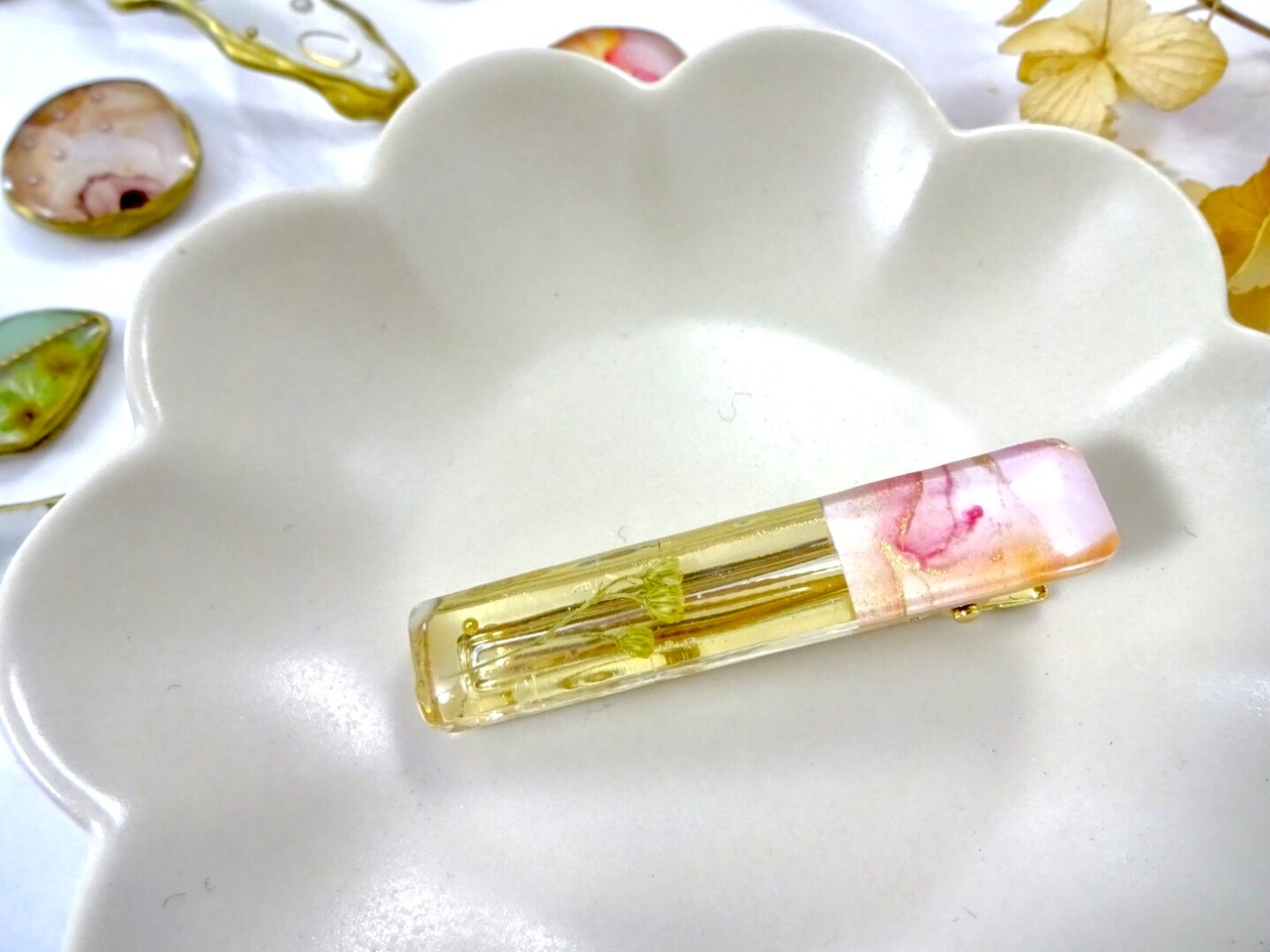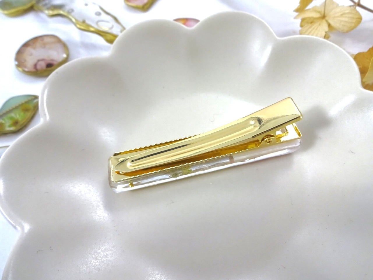 レジンのデザインパーツをひとつひとつ手作りしています。そのため同じデザインを作ったとしても、色や形がわずかに異なります。すべての作品はほぼ一点ものであることをご理解くださいませ。